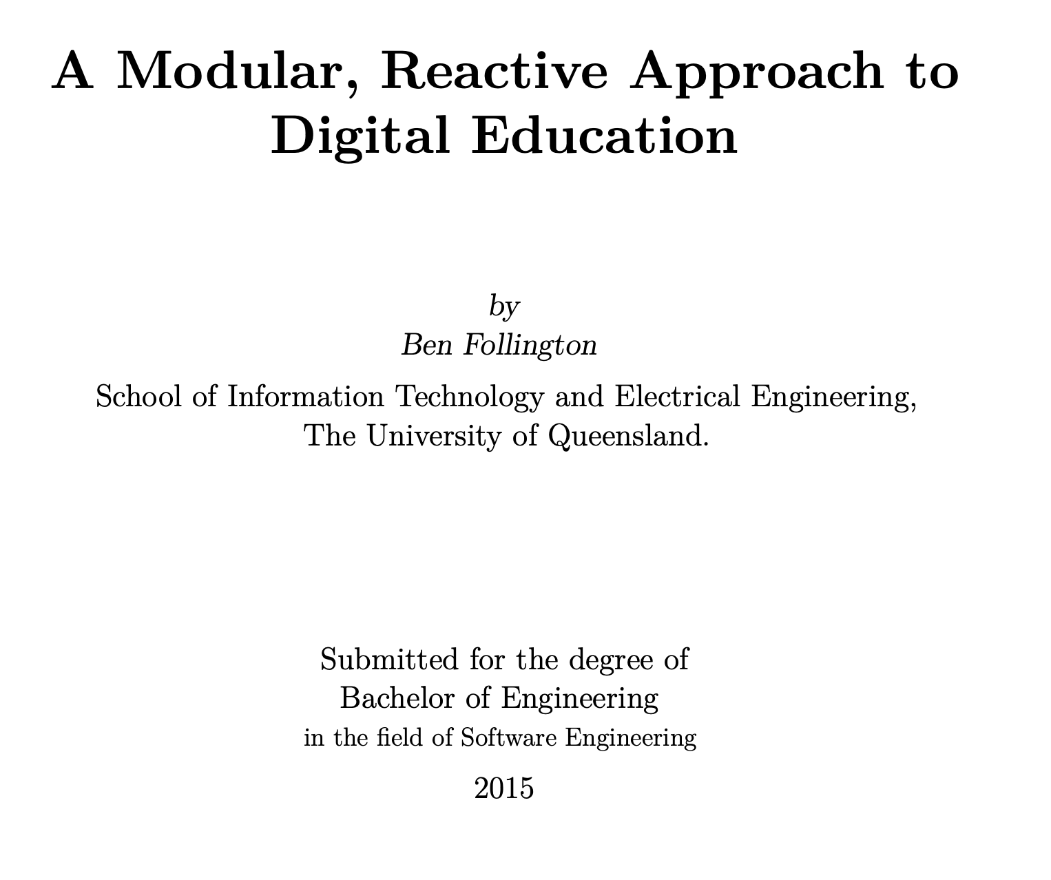A Modular, Reactive Approach to Digital Education Nov 9, 2015 My graduate thesis project at UQ (The University of Queensland. https://cv.bf.wtf/thesis.pdf + ← Index